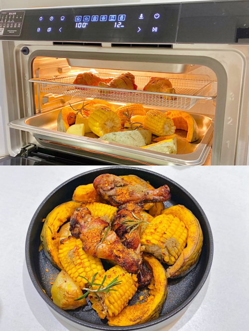 更让Linda惊喜的是,它还能蒸烤分段进行,人性化的设计,大大减少了做菜时因步骤繁琐用时长的问题。比如做烤香酥鸡、烤猪蹄等,就选择先蒸后烤,这样烹制的食物外脆里嫩,回味无穷。如果是做德州扒鸡、烤蹄膀、梅菜扣肉这类皮肉有嚼劲但口感酥烂有汤汁的食材,就选择先烤后蒸,食材烤过之后上色、脱油,再通过蒸制使食物软烂,别具风味。