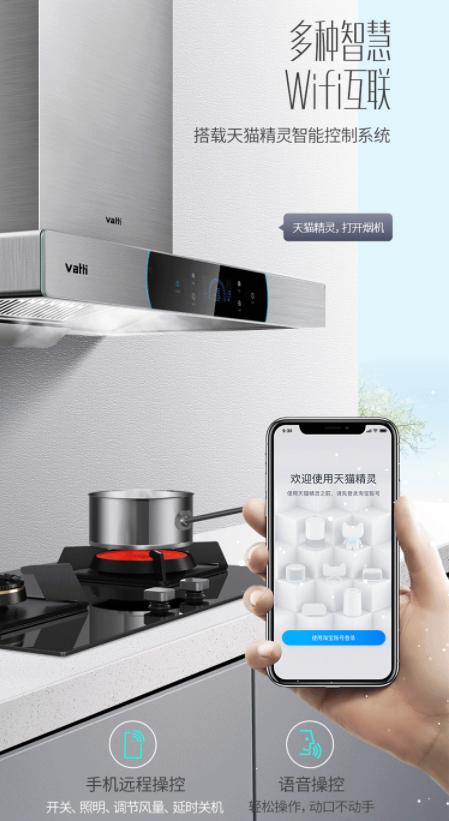 在智能化家电的大势下,华帝品牌自然不甘落后,紧跟智能潮流的步伐。这款油烟机还搭载有Wifi语音互联技术,通过在指定APP上的家居联动,实现远程操控与语音提醒。彻底解放用户双手,无需触摸,轻松享受油烟机的全方位服务。