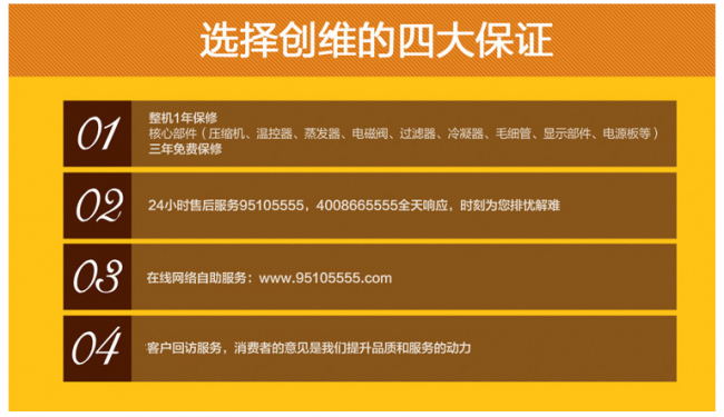只要你选择信赖创维冰箱,我们就一定不会辜负你的信任。用户在使用冰箱时出现了问题,请您一定与我们创维冰箱售后客户联系,我们渴望给予您最及时的帮助,服务热线为95105555 。针对您的使用问题,我们会尽可能处理,给您一个满意的答复。简单一个电话,我们就会迅速为您解决烦恼。