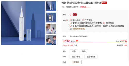 答案显而易见,截至目前为止,37863人心动支持,众筹金额突破752万元,众筹达成率753%,一组漂亮的数据说明,全球首款可视超声波洁牙仪——素诺智能可视超声波洁牙仪T11Pro自上线小米有品众筹平台的那一刻开始就已经注定其会成为网红爆款,俘获万千欢心。