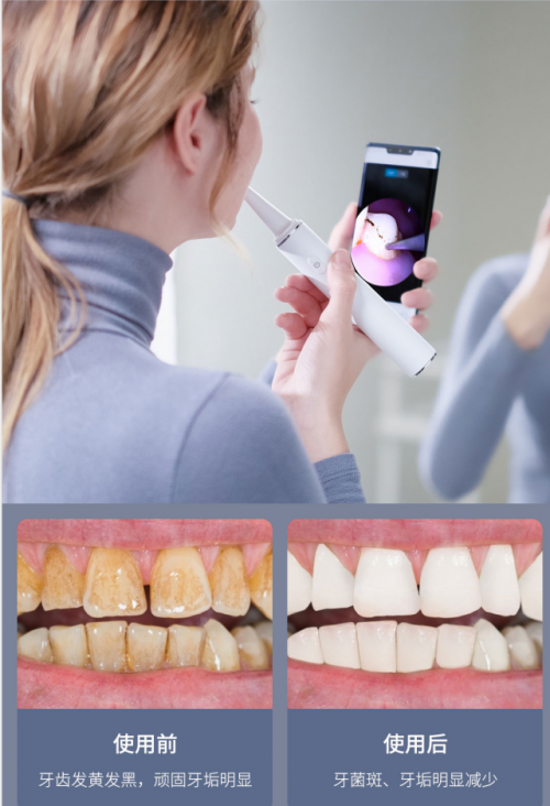 像传统洁牙仪,如果不支持可视化,操作起来就非常不方便,自己在家洁牙,可能你得一手拿洁牙仪,一手还得那牙科口镜,手忙脚乱,容易出错,一不小心可能造成牙面损伤,让你疼痛,如果原本有炎症,还可能加重病情,带来不应有的伤害。另外,这种盲操作清洁起来也不彻底,只清除看得见的牙结石,但留下致病作用最强的深层牙结石,达不到防治牙周病的目的。