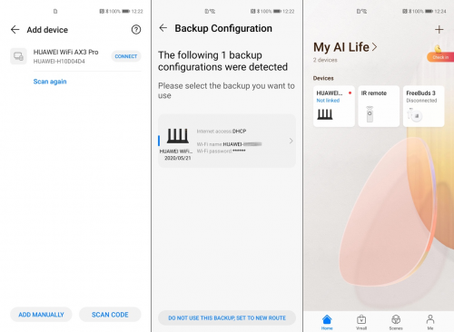 接上网线,打开路由开关,笔者的华为P40 Pro便收到了「智慧生活」App的路由配对连接的弹窗信息,然后按照步骤提示,一会就完成了路由的配置,过程中甚至不用输入宽带的账号和密码,最后只需要输入心怡的Wi-Fi名称和密码即可。对于新手和小白用户来说,格外友好。