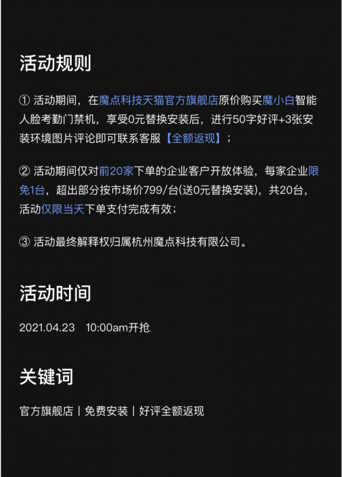 众所周知,魔点之前主推的产品都以高中端市场为主。此前虽然有Y2这样打低端市场的门禁产品,但定价加上安装费仍在千元以上——如今,魔小白智能门卫的推出,799元直接包安装,几乎直指人脸识别门禁的性价比之最。