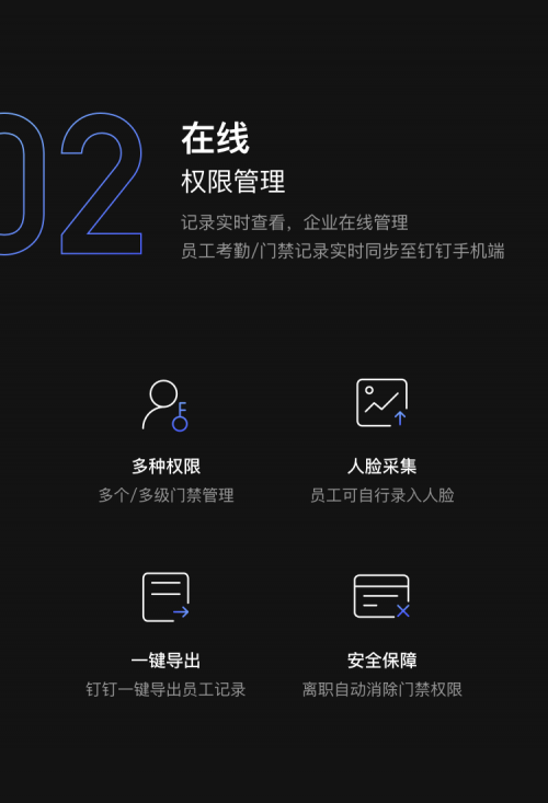 不同于传统门禁录入流程的繁琐,魔小白支持员工在钉钉(手机端)自助录入人脸;员工离职时,推出钉钉组织架构的同时,无需管理员手动操作,自动同步删除门禁权限,提升企业安全。