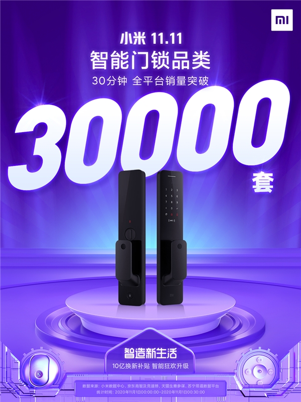 10月21日,2020年双11预售正式“开战”,小米携智能门锁系列掀起预订风暴。11月1日预售开始付尾款,仅30分钟小米智能门锁就销售30000台,10小时销售量达66000台。在京东/苏宁易购渠道 品牌和单品销售额双料冠军,原价1699元的小米智能门锁推拉款到手价1449元,成为同类产品中的爆款产品。