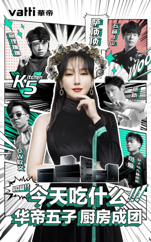 于是我们这位姐姐——个人风格强烈的“神仙级唱作人”萨顶顶老师,用行动表明了自己的成团态度。在她最新发布的MV《今天吃什么》里,就召集了五个男生以“Kitchen5”的称号在华帝厨房成团出道。团员们横跨不同领域,皆是业界顶流——Rapper欧文,每部作品能收获100万+点赞的说唱界创作达人。Dance担当查理蹦蹦,长相清秀的外表下,谁能想到他是抖音破400万关注的灵魂舞者。戏腔担当五音,古风圈的风云人物,可在流行与古风之间自由切换。乐器担当可爱,精通各类弦乐,是获得过微博十大影响力的音乐人。百变担当滕新,国内一线声优,活跃在国漫、游戏、网络剧等主要角色身上。