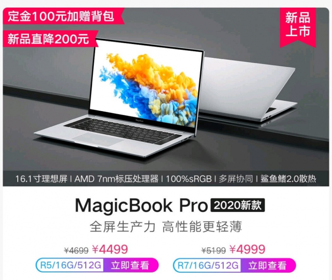 目前,荣耀MagicBook Pro锐龙版已经在华为商城、京东、天猫、亲选商城、荣耀体验店开启预约。而在7月30日首销期间,还有优惠活动推出!荣耀MagicBook Pro锐龙版新品首销优惠200元,R5版售价4499元,R7版售价4999元,限2020年7月30日当天。