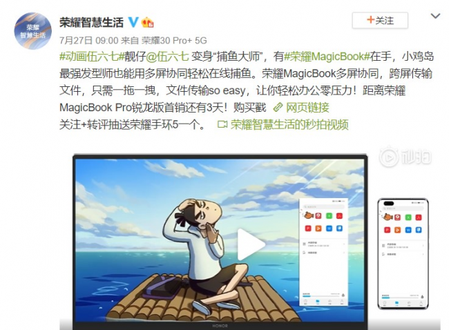 荣耀智慧生活与中国原创动画《伍六七》在今年6月达成合作后互动不断,这期间有着小鸡岛最强发型师头衔的伍六七,更是被荣耀MagicBook Pro锐龙版超强性能和个性化使用体验所打动,并将与好友可乐一起为荣耀MagicBook Pro锐龙版在7月30日首销加油打Call。